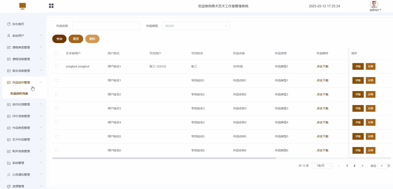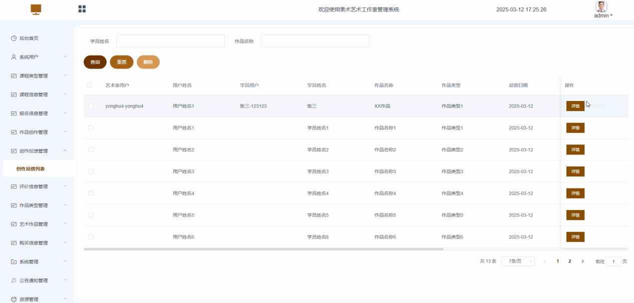 通过管理员可查看和管理艺术家与学生之间的创作反馈信息。管理员能够对创作反馈进行分类、查看和整理,确保反馈信息的准确性和及时性,便于艺术家根据反馈优化创作,并为学生提供必要的指导。创作反馈管理界面如图5-12所示。