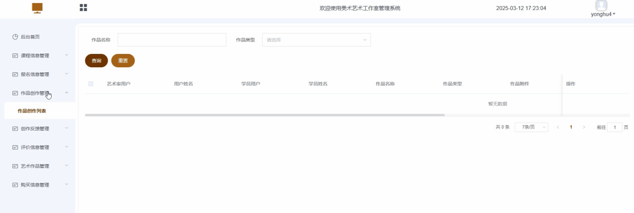 然而,尽管系统在功能上已实现了预期目标,且经过测试验证其稳定性和可用性,但仍有一些许可进一步优化的地方。例如,系统在数据处理和高并发情况下的表现有待提升,部分作用如创作反馈和作品上传在极限情况下可能存在延迟或卡顿现象。未来的研究可以聚焦于优化系统的性能,提高环境的响应速度和稳定性,进一步增强用户体验。此外,还可以增加更多智能化的功能,如基于大数据分析的个性化推荐平台,进一步推动艺术工作室管理的数字化和智能化进程。总的来说,本环境的实现具有较强的实际应用价值和推广潜力,为美术艺术工作室的数字化转型提供了一种实用的解决方案,具有广阔的应用前景。