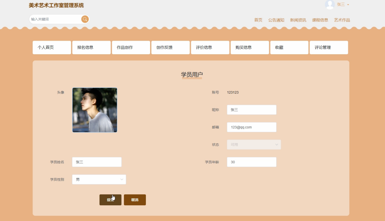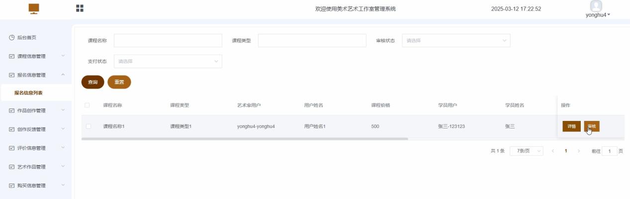 艺术家用户可以管理和查看自己的课程报名信息,包括已报名的课程、报名状态、上课时间等。经过此功能,艺术家可以方便地了解自己参与的课程情况,确保不遗漏任何核心课程安排。报名信息管理界面如图5-6所示。