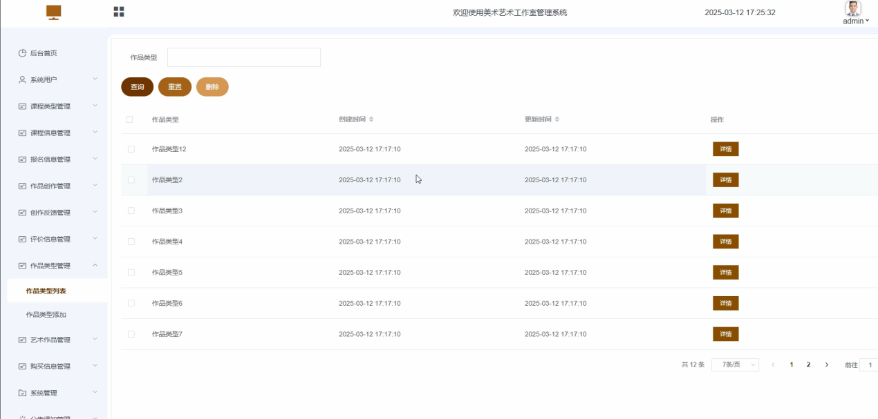 管理员可对系统中的作品类型进行管理,包括创建、修改和删除作品类别。通过合理的分类管理,管理员帮助平台上的艺术作品呈现更加清晰和有序的展示,便于艺术家和学生浏览和选择相关作品。作品类型管理界面如图5-14所示。