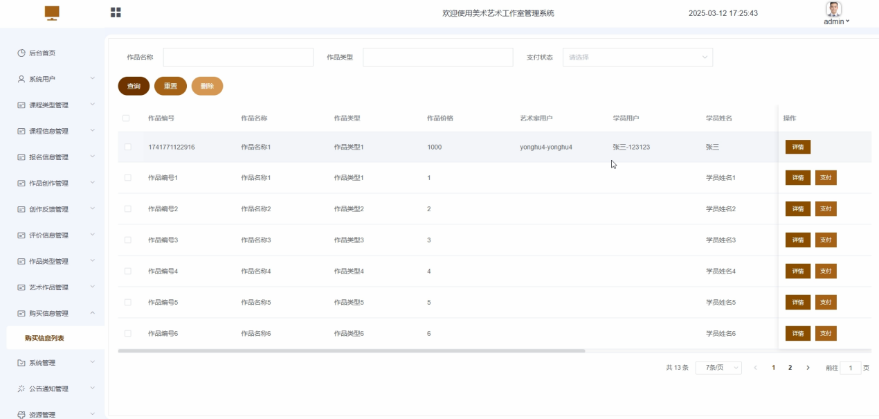 管理员可以查看和管理用户的购买信息,包括订单详情、付款状态和购买记录等。管理员能够及时跟踪艺术作品的销售情况,处理购买过程中出现的问题,并为艺术家提供销售数据分析,支援改进营销策略。购买信息管理界面如图5-15所示。