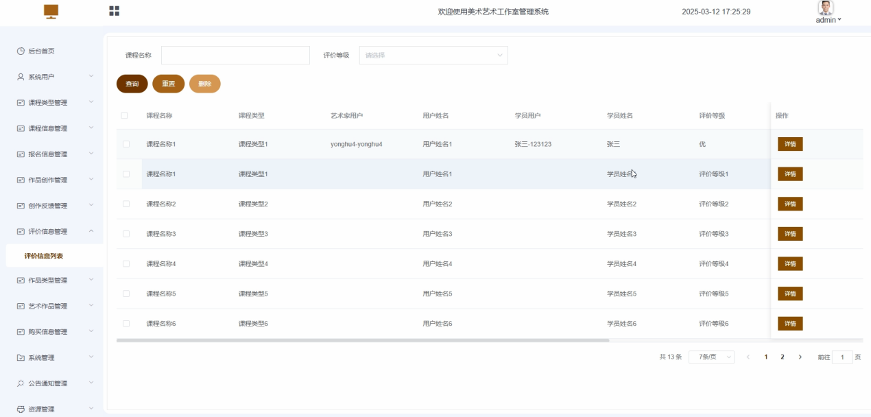 管理员负责管理系统中关于课程和作品的所有评价信息。管理员行查看、删除或修改用户对课程和作品的评价,确保评价内容的合理性与合规性,避免不良评论对平台的影响。同时,管理员可能通过评价信息分析用户的需求和满意度。评价信息管理界面如图5-13所示。