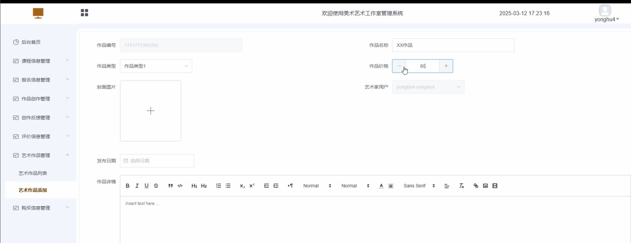 管理员负责审核和管理用户上传的艺术作品,确保作品符合平台的标准与要求。管理员可以对作品进行审核、编辑、删除和分类,确保平台上展示的作品质量高、内容规范,推动艺术创作的良性发展。作品创作管理界面如图5-11所示。