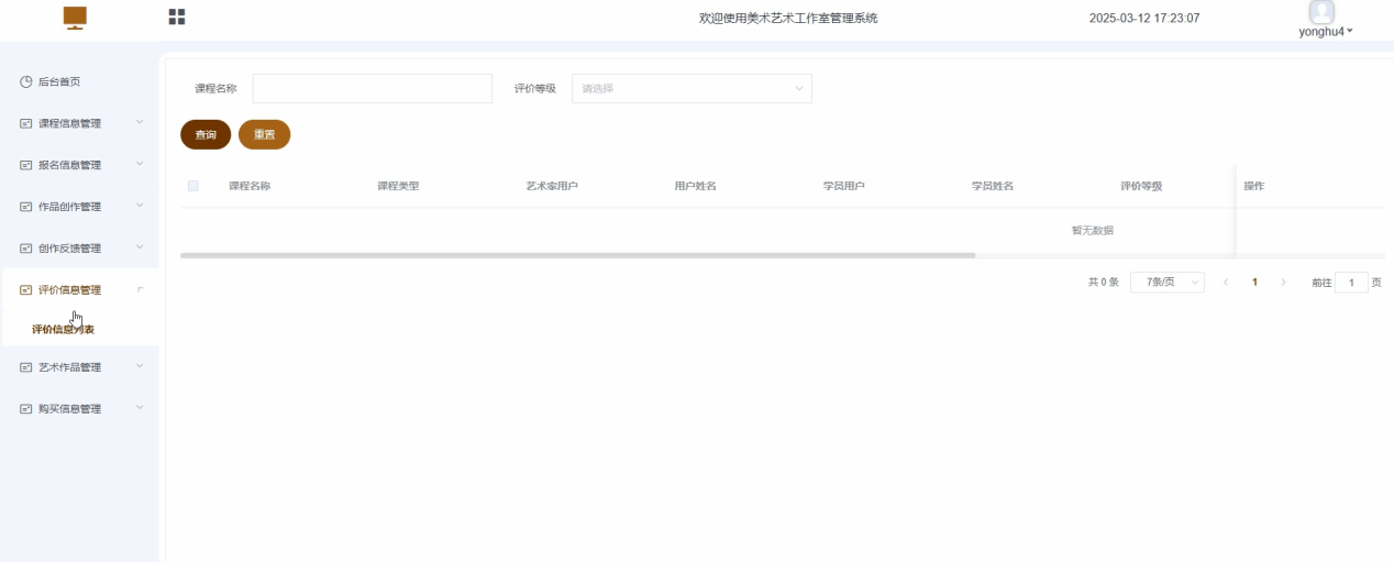 艺术家用户许可查看自己课程或作品的评价信息,包括学生的课程反馈、作品评论等。艺术家能够根据反馈调整教学内容或创作方向,不断优化教学质量和作品展示效果。评价信息管理界面如图5-8所示。