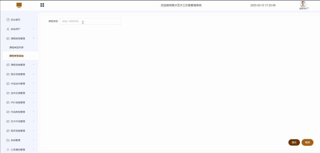 管理员可以对系统中的课程类型进行管理,包括新增、编辑、删除课程类型。通过该功能,管理员能够对课程进行分类,确保课程内容的结构化和清晰化,方便学生和艺术家在系统中查找和选择相应的课程。课程类型管理界面如图5-10所示。