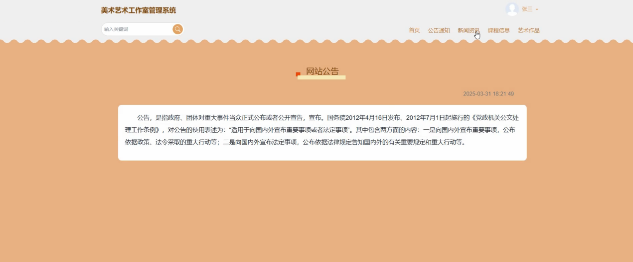 本论文设计并实现了一个基于Spring Boot和Vue框架的美术艺术工作室管理系统。通过对美术艺术工作室管理现状的调研,发现传统的人工管理方式存在效率低、信息传递不畅、资源难以整合等问题。本系统采用前后端分离的B/S架构,后端利用Spring Boot框架进行高效的数据处理和业务逻辑管理,前端则利用Vue框架构建响应式用户界面,提升了用户体验和操作效率。平台主要功能涵盖课程管理、作品展示与创作、创作反馈与评价等多方面,满足了管理员、艺术家和学生三类用户的不同需求。通过系统的实现,成功解决了传统管理方式中的许多问题,使得艺术工作室的运营更加高效、透明,促进了艺术创作与教育的协同发展。