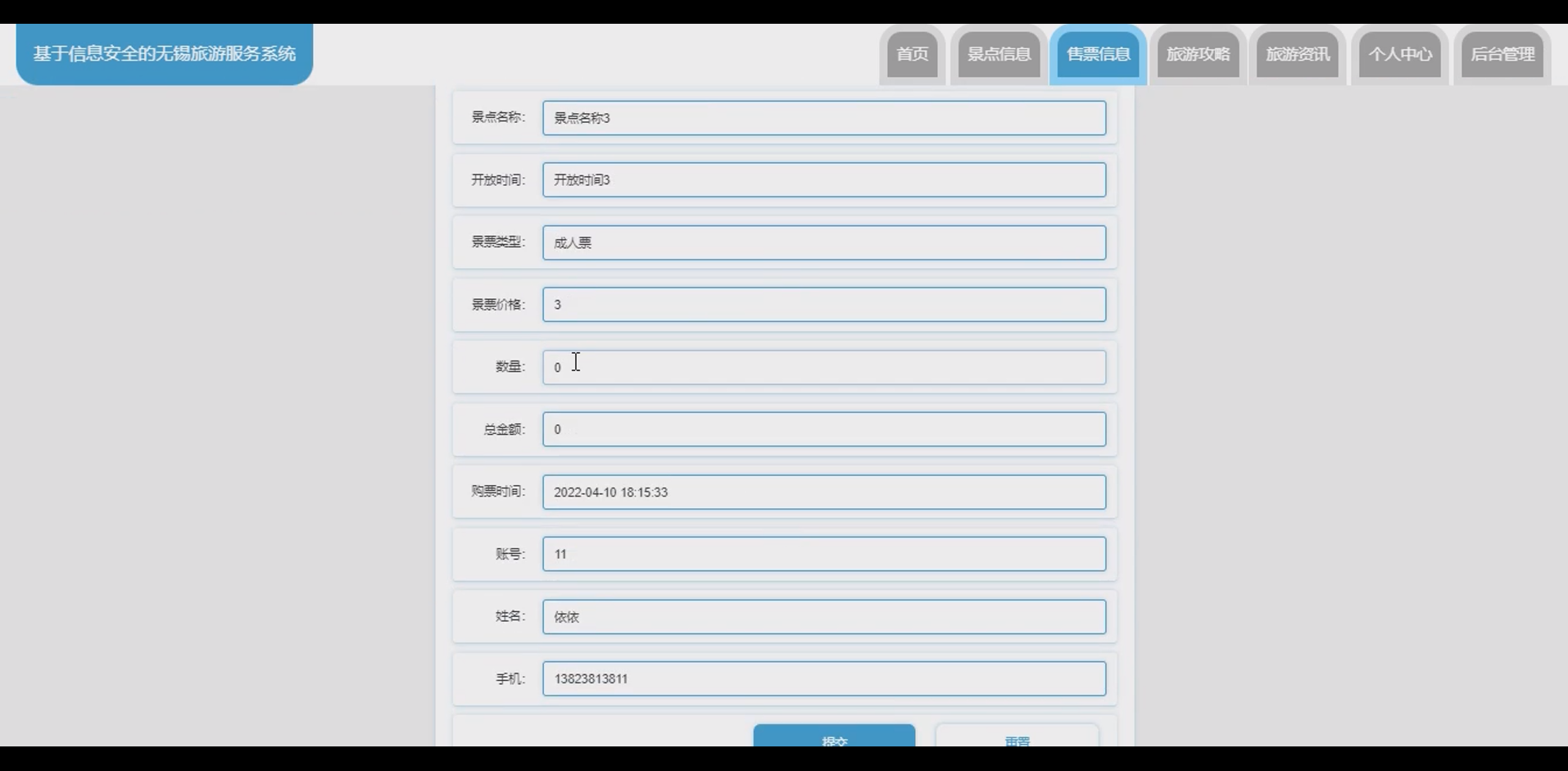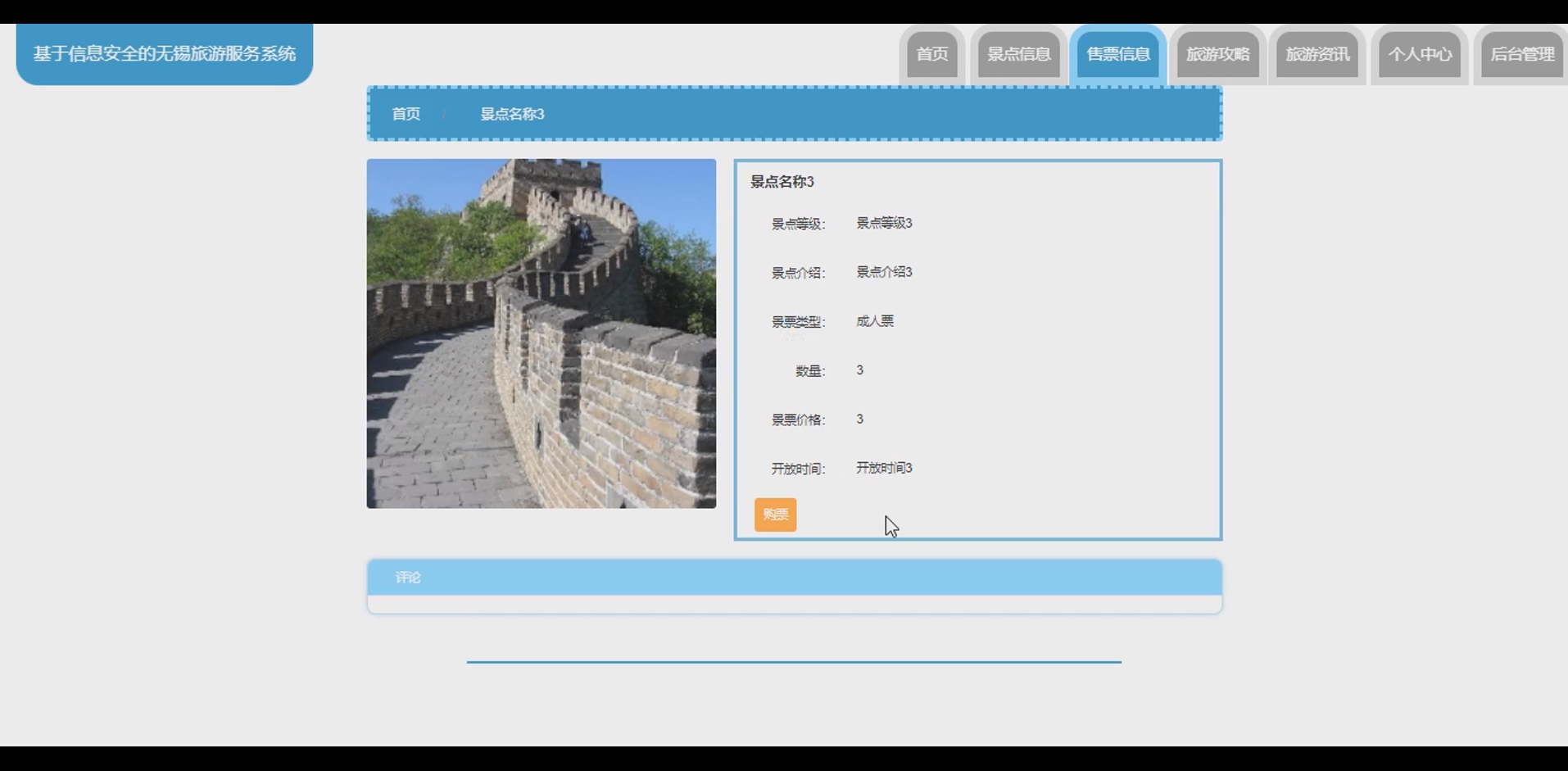 1. 一套基于SSM框架的无锡旅游服务系统,实现用户管理、景点信息管理、售票购票管理、旅游攻略管理等核心功能,具备完善的信息安全防护机制,可正常运行并满足用户需求。