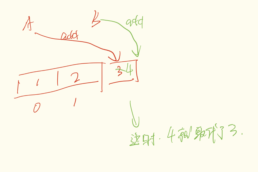 元素覆盖(两线程同时获取到了地址0,一个add了1,一个add了2,2覆盖了1的内容)