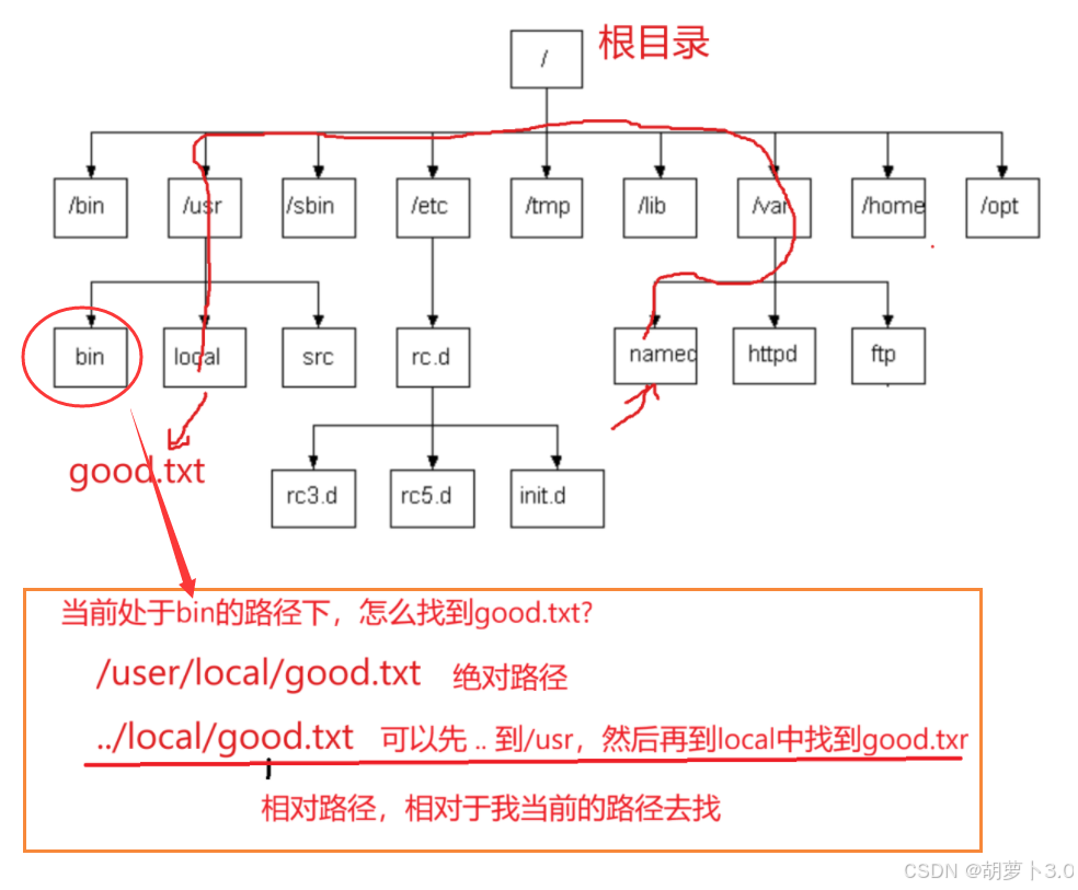 这样:/usr/bin/hello.txt就是我们是不是进入根目录/,到usr,再到bin中找到hello.txt,也就