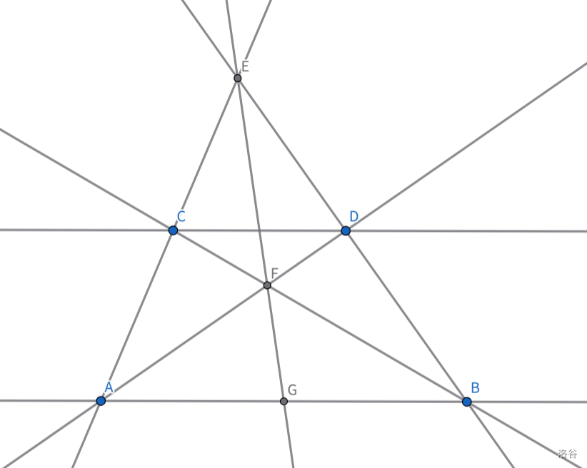 作直线 $AC,BD$ 交于点 $E$,连接 $AD,BC$ 交于点 $F$,延长 $EF$ 交 $AB$ 于点 $G$。点 $G$ 即为所求。