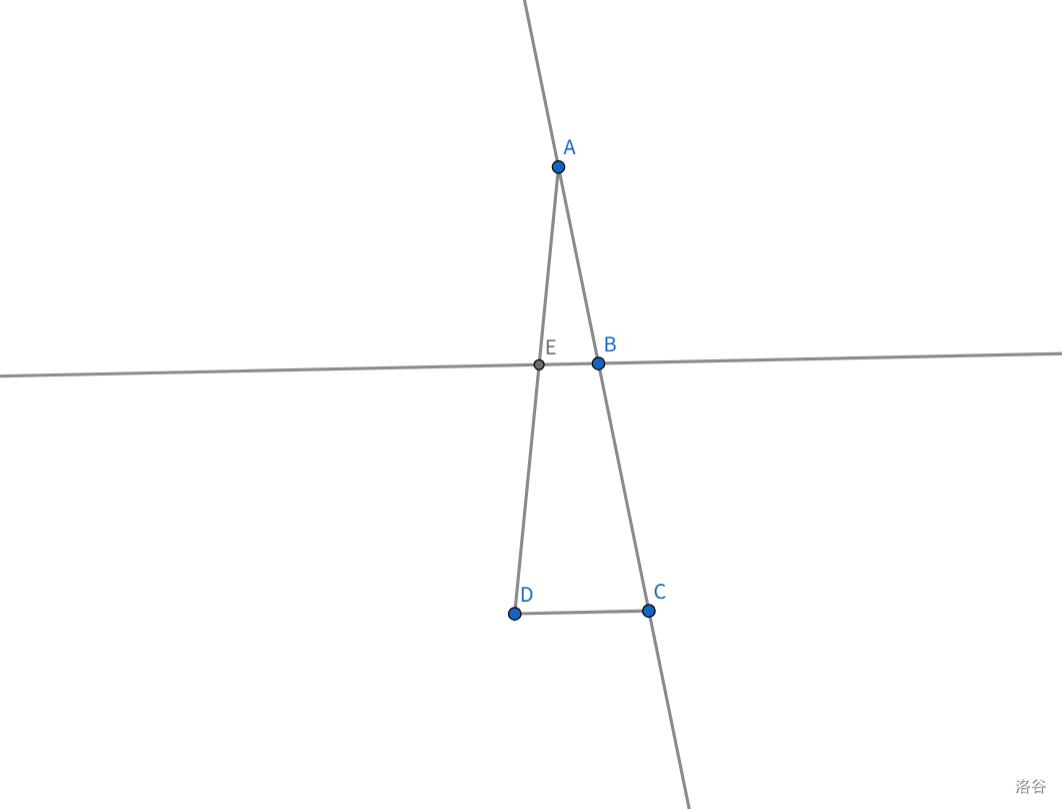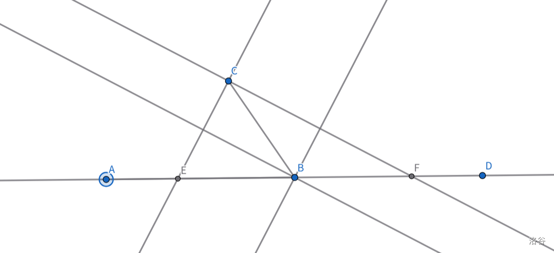 加减的话,先通过平移让他们有一个公共的端点(如图所示,要计算 $AB+BC$ 和 $AB-BC$),我们可以作 $\angle ABC$ 的平分线和 $\angle BCD$ 的平分线。然后过点 $C$ 分别作两条平分线的垂线交 $AD$ 于 $E,F$,则 $AE=AB-BC,AF=AB+BC$。
