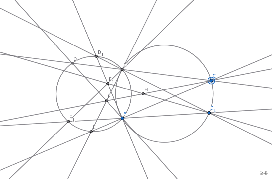 1. 如图所示:在右边的圆选取一点 $C$,过点 $C$ 作与圆相交的直线 $BD,AE$。连接 $AD,BE$ 交于点 $F$,连接 $CF$。再在左边的圆选取一点 $C_1$,然后同上述操作。最终 $CF,C_1F_1$ 会交于点 $H$。可以证明:$AH,BH$ 为左边圆的切线。