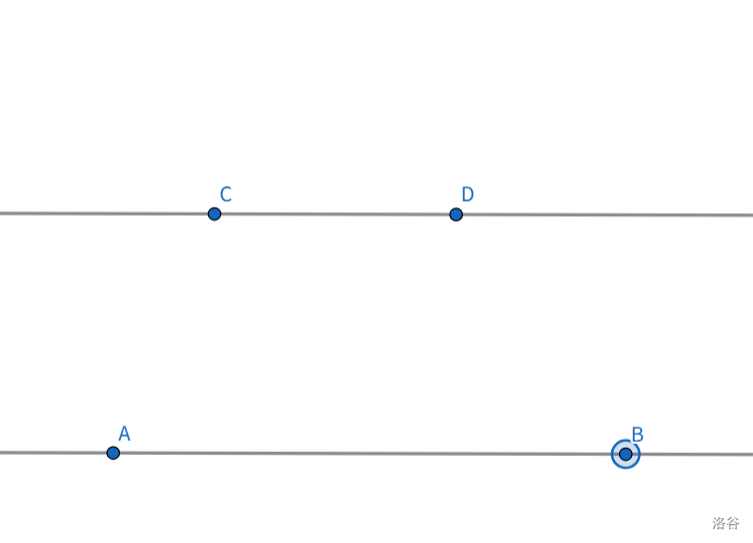 然后再看如何已知平行线做中点(如下图,已知直线 $AB$ 与直线 $CD$,$AB\parallel CD$,求做 $AB$ 中点):
