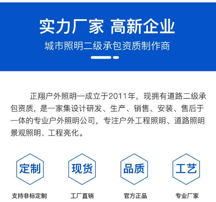 广东正翔照明有限公司是集研发、设计、生产、销售、安装、售后于一体的专业户外照明公司,拥有城市道路二级承包资质,1.2万㎡现代化生产基地,重点覆盖广东、江苏、福建、海南、云南等省份,专注于市政路灯、景观灯、太阳能照明等产品的批量定制与按需定制,以一站式服务、高性价比产品、可靠品质赢得客户认可,是国内市政路灯定制领域的实干型品牌。