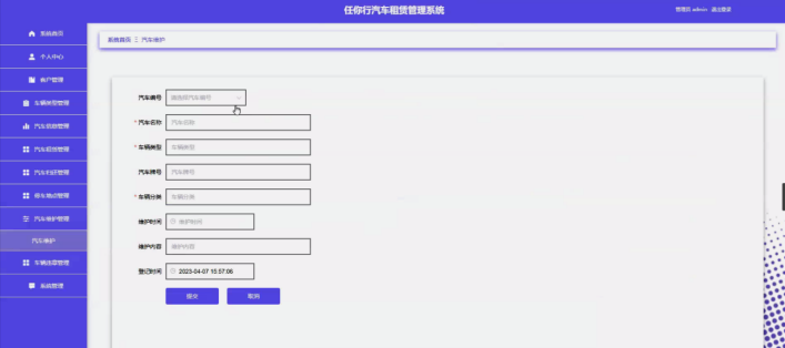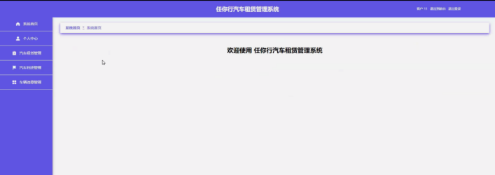 客户进入后台管理页面,主要功能包括对系统首页、个人中心、汽车租赁管理、汽车归还管理、车辆违章管理进行相关管理,后台管理页面如图5-17所示: