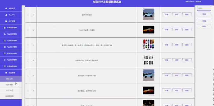管理员点击系统管理可以对租车公告、在线客服、关于我们、轮播图管理进行详细运行;如图5-16所示: