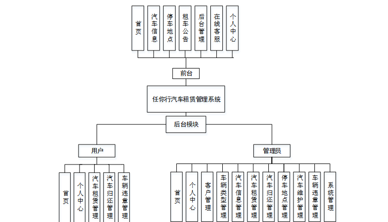 管理员模块属于是网站的后台,进入之后有大量的管理员效果,管理员也可能运用用户模块的功能,为了维护网站的稳定与页面的布局,将管理员模块的功能详细化后可能使用系统管理对页面进行布局修改,允许发布公告提示用户规范,用户模块只可以对个人中心、汽车租赁管理、汽车归还管理、车辆违章管理等进行查询等,并且更改个人信息,任你行汽车租赁管理系统总体结构图如图4-2所示。