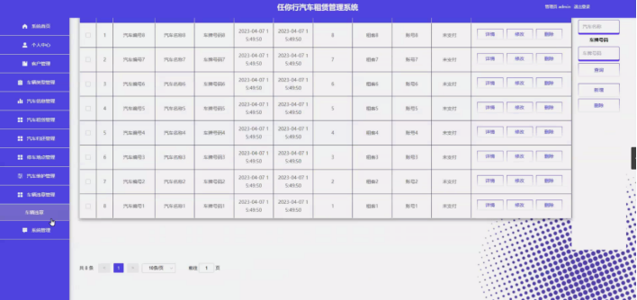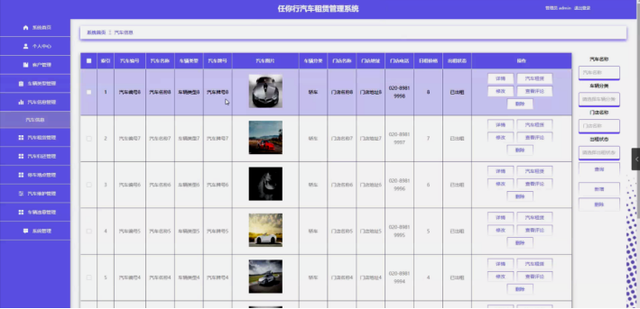 管理员点击汽车信息管理。进入汽车信息管理页面输入汽车名称、车辆类型、门店名称、出租状态可以查询、新增或删除汽车信息,并进行详情、汽车租赁、修改、查看评论或删除操作。如图5-10所示: