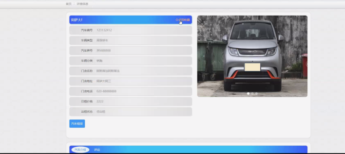 在汽车信息页面输入汽车名称、车辆分类、门店名称、出租状态进行查询车辆详细信息;并对汽车信息进行收藏、汽车租赁或评论的操作,汽车信息页面如图5-3所示: