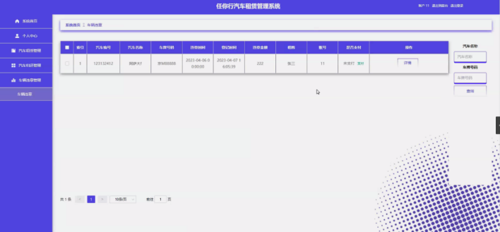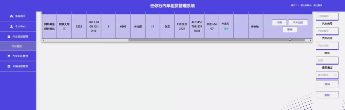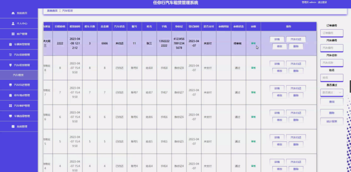 汽车租赁页面,在汽车租赁页面的输入订单编号、汽车编号、汽车名称、姓名、是否通过进行查询汽车租赁详细信息,并对详情、支付、汽车归还、删除等进行管理;汽车租赁详细信息页面如图5-18所示: