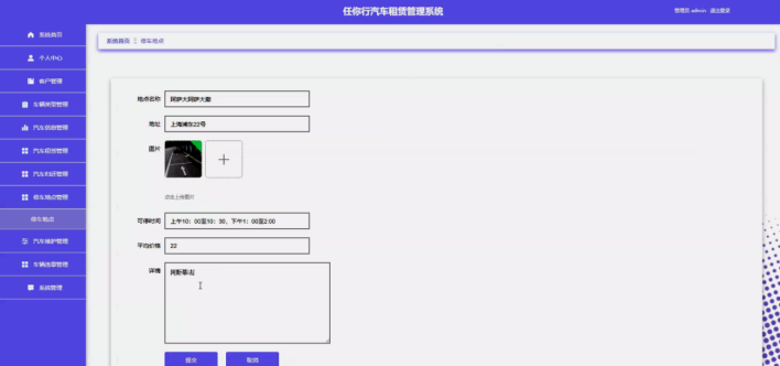 通过管理员点击停车地点。进入停车地点页面输入地点名称、地址能够查询,新增或删除停车地点信息,并进行详情,修改删除等处理。如图5-15所示:
