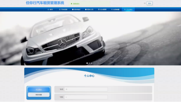 客户进入主页面,主要效果包括对首页、汽车信息、停车地点、租车公告、后台管理、在线客服、个人中心等进行操作。用户主页面如图5-2所示