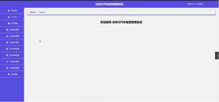管理员进入主页面,主要效果包括对首页、个人中心、客户管理、车辆类型管理、汽车信息管理、汽车租赁管理、汽车归还管理、停车地点管理、汽车维护管理、车辆违章管理、系统管理等进行操作。管理员主页面如图5-7所示: