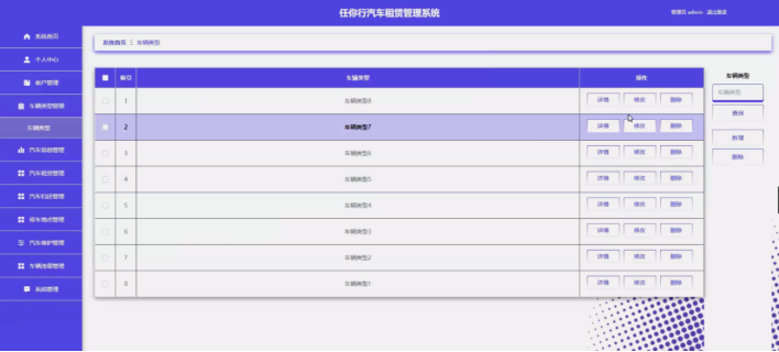 管理员点击车辆类型管理。进入车辆类型管理页面输入车辆类型可以查询、新增或删除车辆类型信息,并进行详情,修改,或删除操作。如图5-9所示: