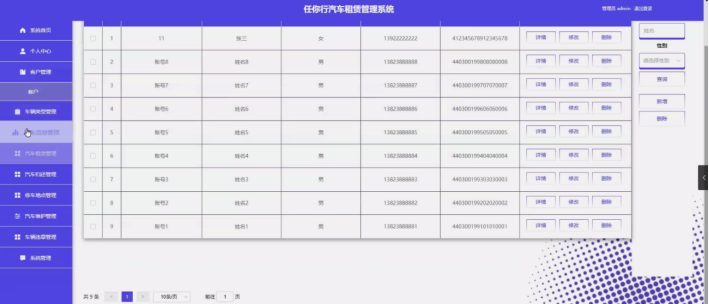 管理员点击客户管理。进入客户管理页面输入客户姓名性别进行查询、新增和删除客户信息,并进行详情,修改和删除管理;如图5-8所示: