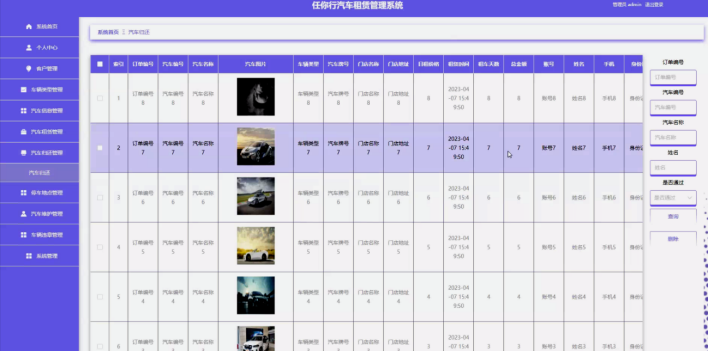 通过否通过能够查询、或删除汽车归还信息,并进行审核或修改操作。如图5-12所示:就是管理员点击汽车归还管理。进入汽车归还管理页面输入汽车编号、订单编号、汽车名称、姓名、