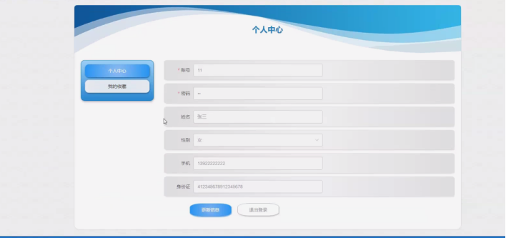 在个人中心页面可以更新个人详细信息,并对我的收藏内容进行运行;如图5-4所示: