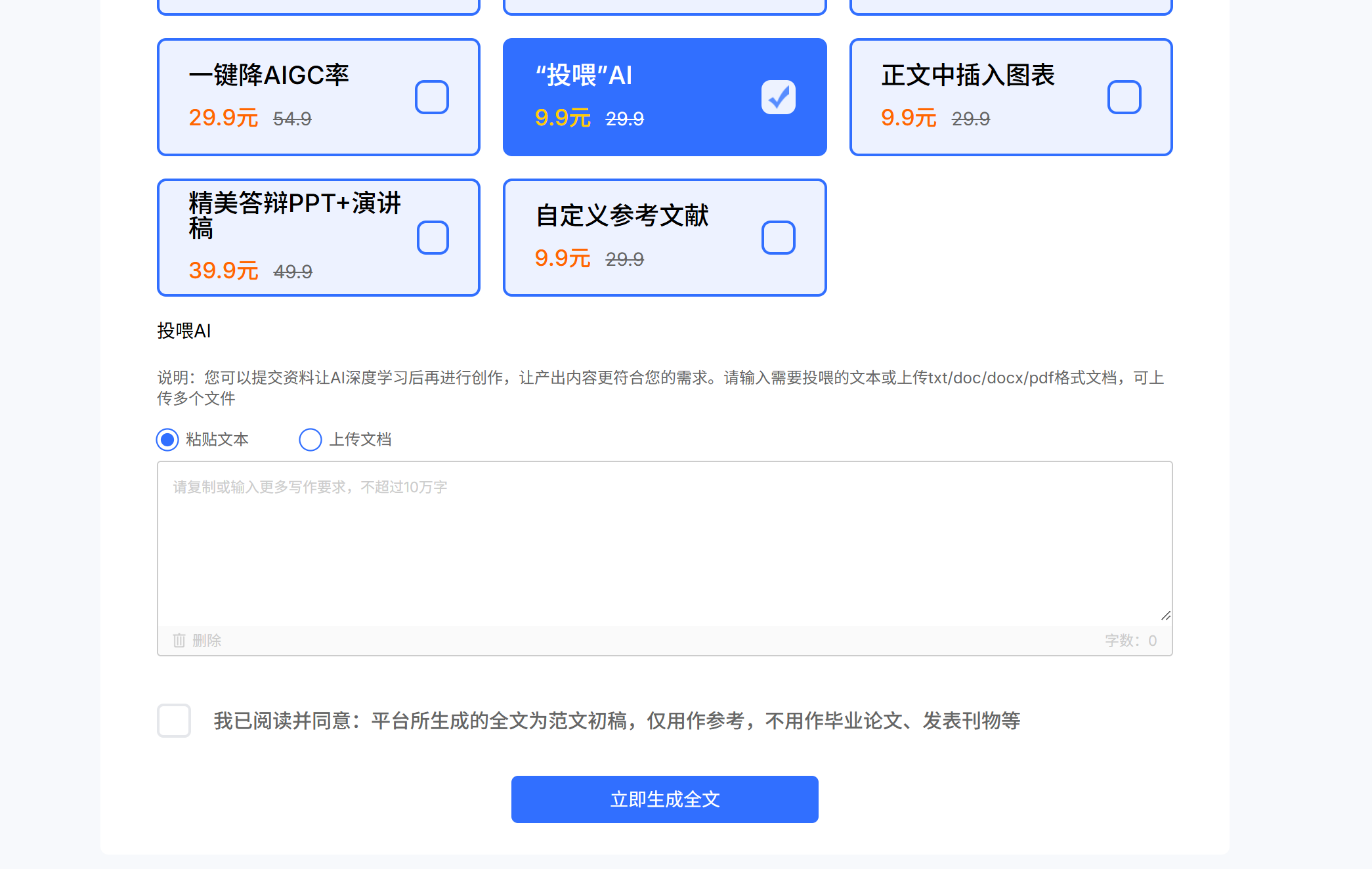 更值得一提的是平台的 “投喂 AI” 功能。用户可上传指定文献、实验数据等资料,让 AI 深度学习后再进行创作,有效解决了普通 AI 平台内容泛化、贴合度不足的问题。同时支持无限改稿服务,用户可对不满意的段落随时重新生成或修改,直到达到理想效果。