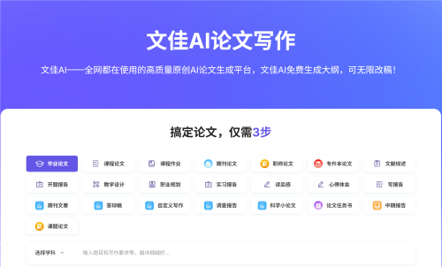 文佳 AI 是一款专注于AI论文写作领域的人工智能工具,依托先进的自然语言处理技术,整合海量学术资源与专业算法模型,为用户提供从选题构思、大纲生成、初稿撰写到润色修改、文献管理的一站式论文写作支持服务。旨在通过智能化手段提升学术写作效率与质量,助力用户轻松应对各类论文创作需求。