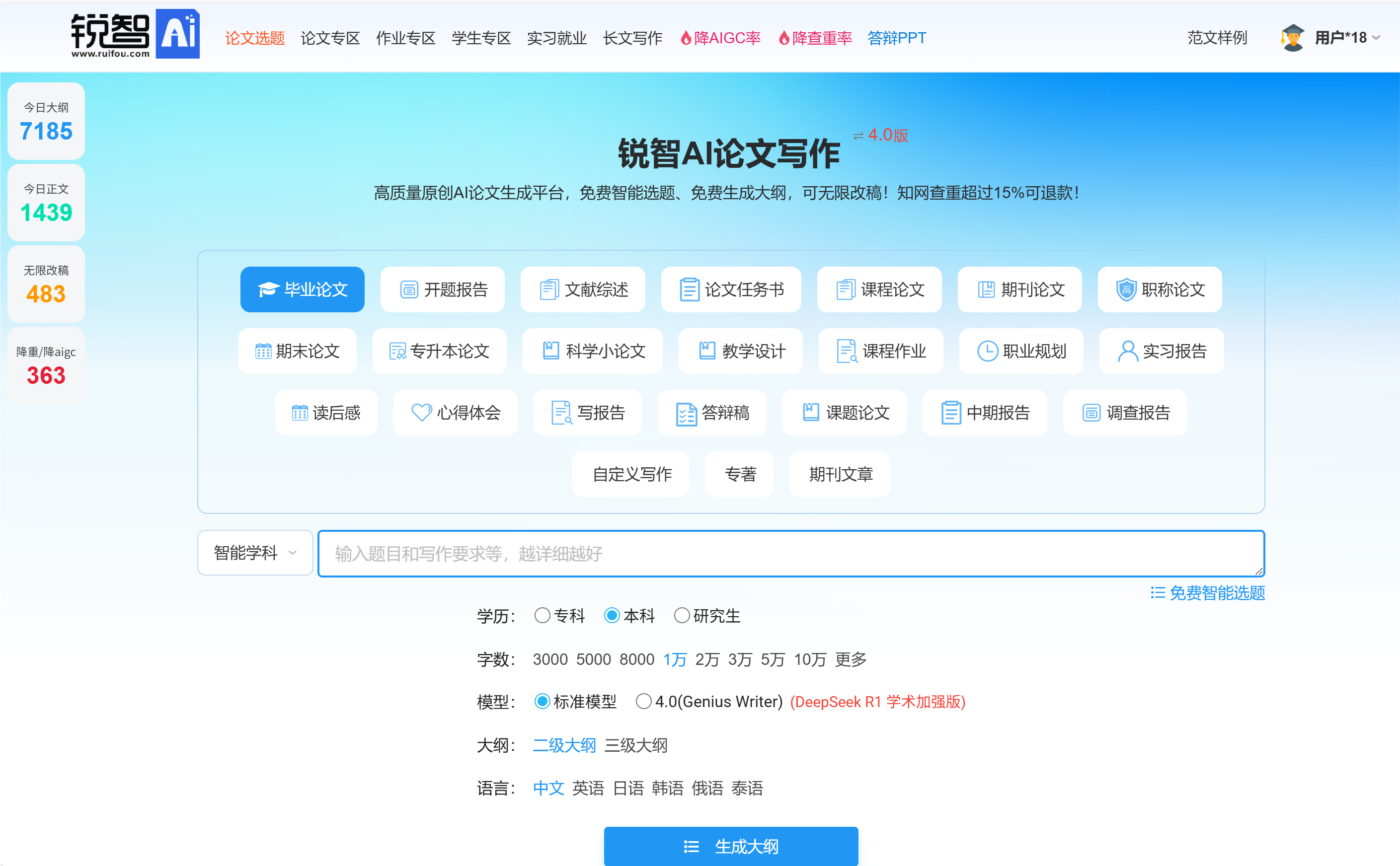 我个人私心最喜欢的就是锐智AI了,可以说,这是一款我反复爱上的实用神器,操作流程非常简单的,不需要反复多次的交互,只需要把论文的题目,关键词和涉及到的学科领域填写完成即可,平台就能迅速生成一篇从3000字到10万字的论文,包括论文大纲、正文内容、文献引用都符合当下学术规范,而且最新学术版模型,专为论文而生,实力大幅提升,遥遥领先。