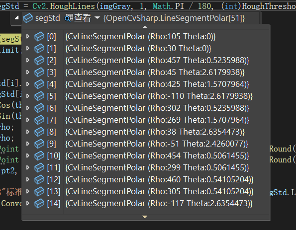 注意看这个方法返回的是LineSegmentPolar[],LineSegmentPolar是OpenCV中用于表示极坐标直线的结构体。