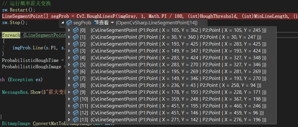 ProbabilisticHoughTime = $"概率霍夫变换耗时: {sw.ElapsedMilliseconds} 毫秒 (检测到 {segProb.Length} 条线)";
