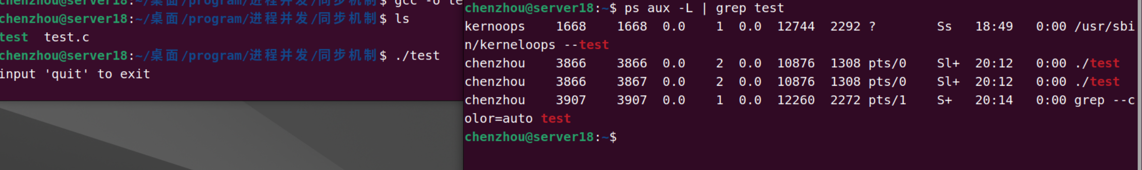 我们在启动程序的时候可以使用第一节课学的 ps aux -L | grep test查看这两个线程