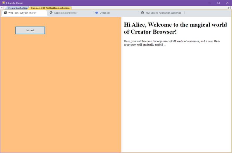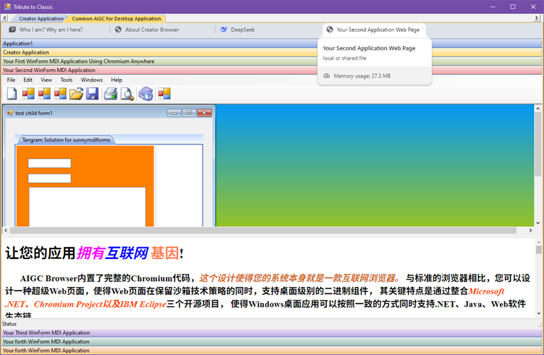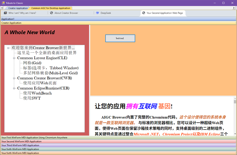 这意味着,她最简单的窗体,拥有强大的基于Web逻辑组合各种各样“控件、窗体”的能力。不仅如此,她的应用之中,可以让你直接构造形形色色的“超级浏览器窗口”: