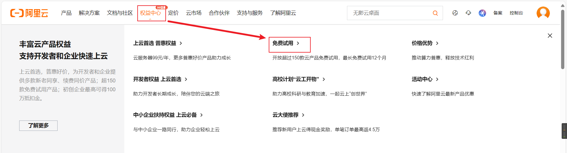 首页点击权益中心,然后点击免费试用