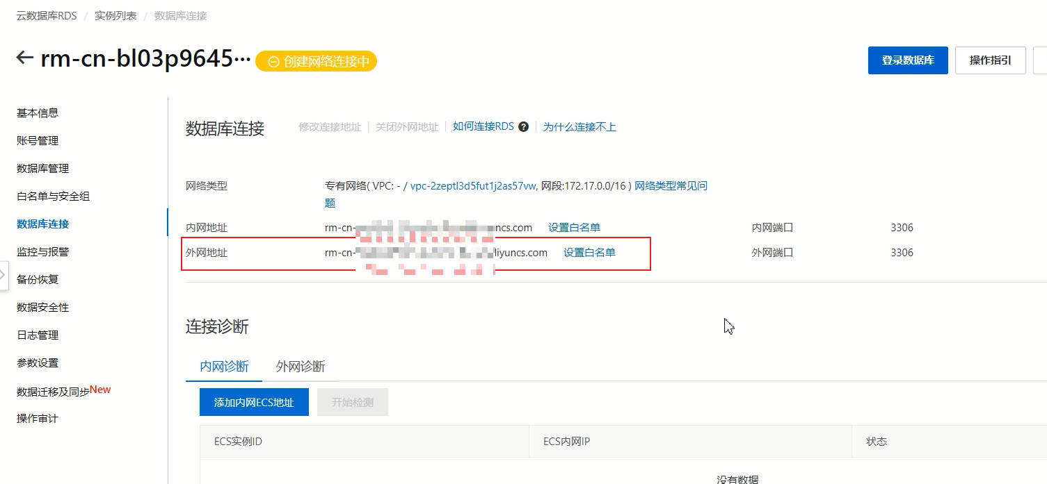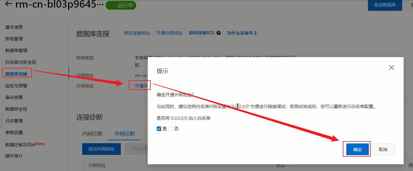 1. 点击数据库连接,然后点击开通外网地址