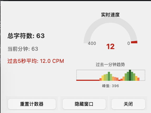 import mathclass TypingCounter:def __init__(self):self.char_count = 0self.is_counting = Trueself.window_hidden = Falseself.key_timestamps = deque(maxlen=1000)self.timestamps_lock = Lock()self.cpm_history = deque(maxlen=60)self.history_lock = Lock()self.root = tk.Tk()self.root.title("打字计数器 - 按Ctrl+Shift+T显示窗口")self.root.overrideredirect(True)self.root.attributes('-topmost', True)self.root.geometry('+20+70')self.root.configure(bg='#f0f0f0')self.main_container = tk.Frame(self.root, bg='#f0f0f0')self.main_container.pack(padx=10, pady=10)self.stats_frame = tk.Frame(self.main_container, bg='#f0f0f0')self.stats_frame.pack(side='left', padx=(0, 15))self.total_label = tk.Label(self.stats_frame,text="总字符数: 0",font=("Microsoft YaHei", 12, "bold"),bg='#f0f0f0',fg='#333333')self.total_label.pack(anchor='w', pady=(0, 5))self.current_min_label = tk.Label(self.stats_frame,text="当前分钟: 0",font=("Microsoft YaHei", 10),bg='#f0f0f0',fg='#666666')self.current_min_label.pack(anchor='w', pady=(0, 5))self.avg_label = tk.Label(self.stats_frame,text="过去5秒平均: 0 CPM",font=("Microsoft YaHei", 10),bg='#f0f0f0',fg='#228B22')self.avg_label.pack(anchor='w', pady=(0, 5))self.gauge_frame = tk.Frame(self.main_container, bg='#f0f0f0')self.gauge_frame.pack(side='right')self.canvas_width = 140self.canvas_height = 160self.canvas = tk.Canvas(self.gauge_frame,width=self.canvas_width,height=self.canvas_height,bg='#f0f0f0',highlightthickness=0)self.canvas.pack()self.gauge_center_x = self.canvas_width // 2self.gauge_center_y = 70self.gauge_radius = 45self.gauge_width = 12self.chart_x = 5self.chart_y = 120self.chart_width = 130self.chart_height = 20self.gauge_arc = Noneself.gauge_text = Noneself.bar_chart_items = []self.chart_title_text = Noneself.chart_peak_text = Noneself.chart_grid_lines = []self.chart_labels = []self.color_gradient = [(0, 25, '#CC0000'), # 暗红色(25, 50, '#E64A19'), # 深橙红色(50, 75, '#FF5722'), # 橙红色(75, 100, '#FF7043'), # 亮橙红色(100, 125, '#FF8A65'), # 浅橙红色(125, 150, '#FFAB40'), # 橙色(150, 175, '#FFC107'), # 琥珀色(175, 200, '#FFD740'), # 浅琥珀色(200, 225, '#C0CA33'), # 黄绿色(225, 250, '#9CCC65'), # 浅黄绿色(250, 275, '#7CB342'), # 浅绿色(275, 300, '#4CAF50'), # 绿色(300, 325, '#43A047'), # 深绿色(325, 350, '#388E3C'), # 更深绿色(350, 375, '#2E7D32'), # 深绿色(375, 405, '#1B5E20') # 最深绿色]self.draw_gauge_background()self.draw_chart_background()self.button_frame = tk.Frame(self.root, bg='#f0f0f0')self.button_frame.pack(fill='x', padx=10, pady=(0, 10))self.reset_btn = tk.Button(self.button_frame,text="重置计数器",command=self.reset_counters,font=("Microsoft YaHei", 9),bg='#ff6b6b',fg='black',relief='flat',padx=10,pady=3)self.reset_btn.pack(side='left')self.hide_btn = tk.Button(self.button_frame,text="隐藏窗口",command=self.toggle_window_visibility,font=("Microsoft YaHei", 9),bg='#6b6bff',fg='black',relief='flat',padx=10,pady=3)self.hide_btn.pack(side='left', padx=(5, 0))self.close_btn = tk.Button(self.button_frame,text="关闭",command=self.on_close,font=("Microsoft YaHei", 9),bg='#cccccc',fg='black',relief='flat',padx=10,pady=3)self.close_btn.pack(side='right')self.main_container.bind('<ButtonPress-1>', self.start_move)self.main_container.bind('<ButtonRelease-1>', self.stop_move)self.main_container.bind('<B1-Motion>', self.on_move)self.last_second_update = time.time()self.keyboard_listener = Noneself.start_global_hotkey_listener()self.update_display()def start_global_hotkey_listener(self):def on_activate():if self.window_hidden:self.show_window()def for_canonical(f):return lambda k: f(self.canonical(k))hotkey = keyboard.HotKey(keyboard.HotKey.parse('<ctrl>+<shift>+t'),on_activate)self.keyboard_listener = keyboard.Listener(on_press=for_canonical(hotkey.press),on_release=for_canonical(hotkey.release))self.keyboard_listener.daemon = Trueself.keyboard_listener.start()def canonical(self, key):if key is None:return Nonereturn key.canonical if hasattr(key, 'canonical') else keydef draw_gauge_background(self):self.canvas.create_arc(self.gauge_center_x - self.gauge_radius,self.gauge_center_y - self.gauge_radius,self.gauge_center_x + self.gauge_radius,self.gauge_center_y + self.gauge_radius,start=0,extent=180,style='arc',width=self.gauge_width,outline='#e0e0e0')self.canvas.create_text(self.gauge_center_x - self.gauge_radius + 10,self.gauge_center_y,text="400",font=("Microsoft YaHei", 8),fill='#666666')self.canvas.create_text(self.gauge_center_x + self.gauge_radius - 10,self.gauge_center_y,text="0",font=("Microsoft YaHei", 8),fill='#666666')self.canvas.create_text(self.gauge_center_x,self.gauge_center_y - self.gauge_radius - 10,text="实时速度",font=("Microsoft YaHei", 9, "bold"),fill='#333333')def draw_chart_background(self):self.canvas.create_rectangle(self.chart_x,self.chart_y,self.chart_x + self.chart_width,self.chart_y + self.chart_height,outline='#cccccc',width=1)self.chart_title_text = self.canvas.create_text(self.chart_x + self.chart_width // 2,self.chart_y - 10,text="过去一分钟趋势",font=("Microsoft YaHei", 8),fill='#666666')def toggle_window_visibility(self):if self.window_hidden:self.show_window()else:self.hide_window()def hide_window(self):self.root.attributes('-alpha', 0.0)self.root.attributes('-topmost', False)self.window_hidden = Trueself.hide_btn.config(text="窗口已隐藏 (Ctrl+Shift+T显示)")self.root.title("打字计数器 - 窗口已隐藏,按Ctrl+Shift+T显示")def show_window(self):self.root.attributes('-alpha', 1.0)self.root.attributes('-topmost', True)self.window_hidden = Falseself.hide_btn.config(text="隐藏窗口")self.root.title("打字计数器 - 按Ctrl+Shift+T显示窗口")self.root.focus_force()def update_chart_background(self, max_cpm):for item in self.chart_grid_lines + self.chart_labels:self.canvas.delete(item)self.chart_grid_lines = []self.chart_labels = []if max_cpm < 10:max_cpm = 10interval = 50num_intervals = int(math.ceil(max_cpm / interval))for i i