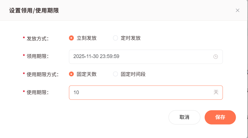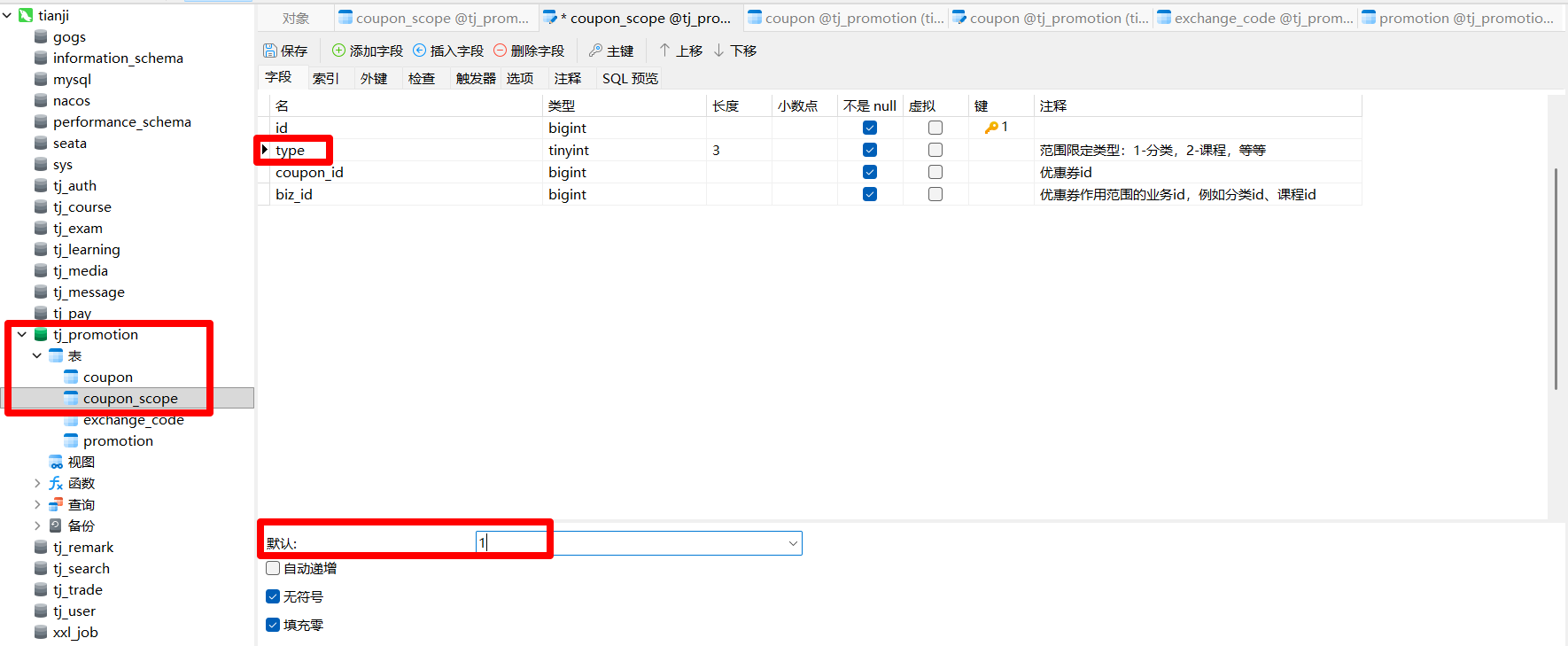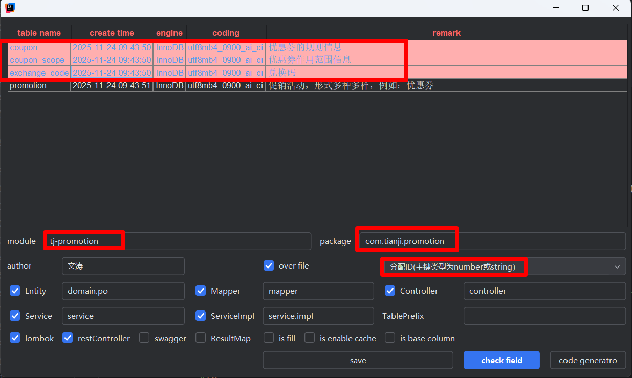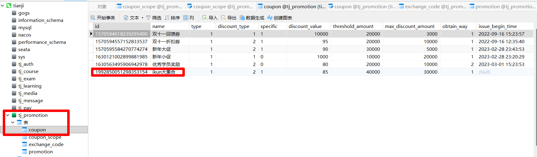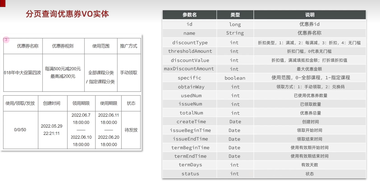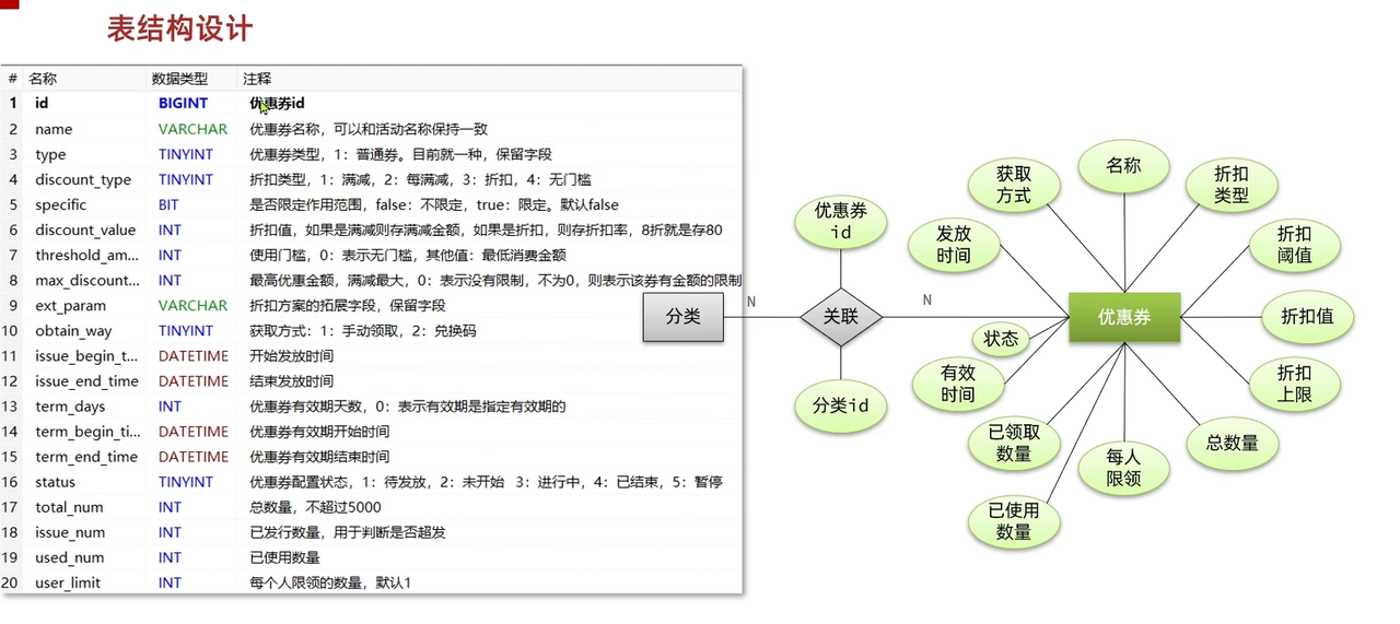 ** @author 文涛* @since 2025-11-24*/ @Data @EqualsAndHashCode(callSuper = false) @Accessors(chain = true) @TableName("coupon") public class Coupon implements Serializable {private static final long serialVersionUID = 1L;/*** 优惠券id*/@TableId(value = "id", type = IdType.ASSIGN_ID)private Long id;/*** 优惠券名称,可以和活动名称保持一致*/@TableField("`name`") //与数据库关键字冲突,需要添加转义字符private String name;/*** 优惠券类型,1:普通券。目前就一种,保留字段*/private Integer type;/*** 折扣类型,1:满减,2:每满减,3:折扣,4:无门槛*/private DiscountType discountType;/*** 是否限定作用范围,false:不限定,true:限定。默认false*/@TableField("`specific`") //与数据库关键字冲突,需要添加转义字符private Boolean specific;/*** 折扣值,如果是满减则存满减金额,如果是折扣,则存折扣率,8折就是存80*/private Integer discountValue;/*** 使用门槛,0:表示无门槛,其他值:最低消费金额*/private Integer thresholdAmount;/*** 最高优惠金额,满减最大,0:表示没有限制,不为0,则表示该券有金额的限制*/private Integer maxDiscountAmount;/*** 获取方式:1:手动领取,2:兑换码*/private ObtainType obtainWay;/*** 开始发放时间*/private LocalDateTime issueBeginTime;/*** 结束发放时间*/private LocalDateTime issueEndTime;/*** 优惠券有效期天数,0:表示有效期是指定有效期的*/private Integer termDays;/*** 优惠券有效期开始时间*/private LocalDateTime termBeginTime;/*** 优惠券有效期结束时间*/private LocalDateTime termEndTime;/*** 优惠券配置状态,1:待发放,2:未开始 3:进行中,4:已结束,5:暂停*/private CouponStatus status;/*** 总数量,不超过5000*/private Integer totalNum;/*** 已发行数量,用于判断是否超发*/private Integer issueNum;/*** 已使用数量*/private Integer usedNum;/*** 每个人限领的数量,默认1*/private Integer userLimit;/*** 拓展参数字段,保留字段*/private String extParam;/*** 创建时间*/private LocalDateTime createTime;/*** 更新时间*/private LocalDateTime updateTime;/*** 创建人*/private Long creater;/*** 更新人*/private Long updater; }