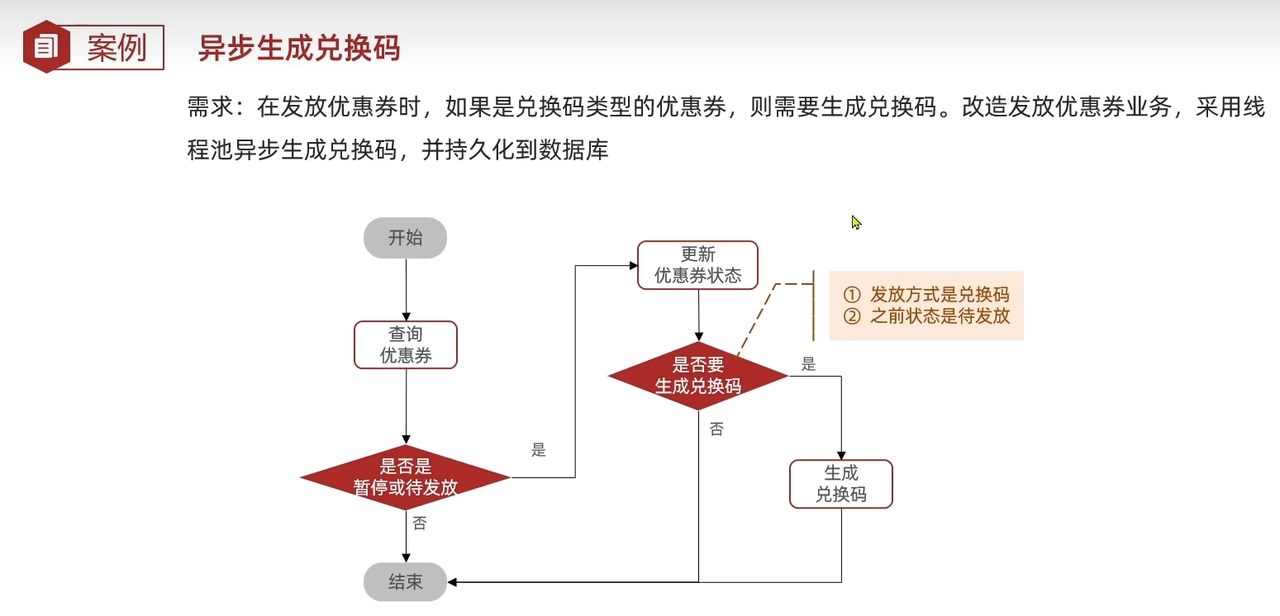 public void beginIssue(CouponIssueFormDTO dto) {// 1.查询优惠券Coupon coupon = getById(dto.getId());if (coupon == null) {throw new BadRequestException("优惠券不存在!");}// 2.判断优惠券状态,是否是暂停或待发放if(coupon.getStatus() != CouponStatus.DRAFT && coupon.getStatus() != PAUSE){throw new BizIllegalException("优惠券状态错误!");}// 3.判断是否是立刻发放LocalDateTime issueBeginTime = dto.getIssueBeginTime();LocalDateTime now = LocalDateTime.now();boolean isBegin = issueBeginTime == null || !issueBeginTime.isAfter(now);// 4.更新优惠券// 4.1.拷贝属性到POCoupon c = BeanUtils.copyBean(dto, Coupon.class);// 4.2.更新状态if (isBegin) {c.setStatus(ISSUING);c.setIssueBeginTime(now);}else{c.setStatus(UN_ISSUE);}// 4.3.写入数据库updateById(c);// 新增 兑换码生成// 5.判断是否需要生成兑换码,优惠券类型必须是兑换码,优惠券状态必须是待发放if(coupon.getObtainWay() == ObtainType.ISSUE && coupon.getStatus() == CouponStatus.DRAFT){coupon.setIssueEndTime(c.getIssueEndTime());codeService.asyncGenerateCode(coupon);}