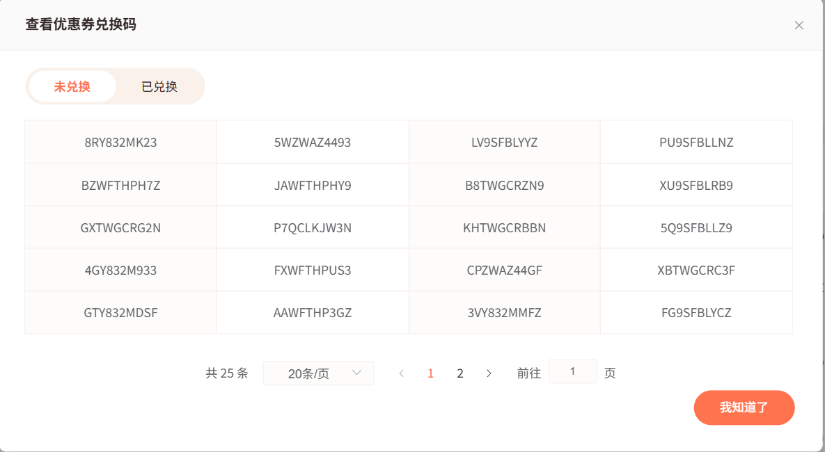 public PageDTO queryExchangeCodePage(CodeQuery query) {//1、分页查询兑换码表Page page = this.lambdaQuery().eq(ExchangeCode::getExchangeTargetId, query.getCouponId()).eq(ExchangeCode::getStatus, query.getStatus()).page(query.toMpPageDefaultSortByCreateTimeDesc());List records = page.getRecords();if (CollUtils.isEmpty(records)) {return PageDTO.empty(page);}//2、封装vo,返回结果List voList = BeanUtils.copyList(records, ExchangeCodeVO.class);return PageDTO.of(page, voList);