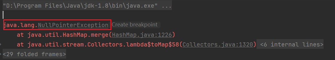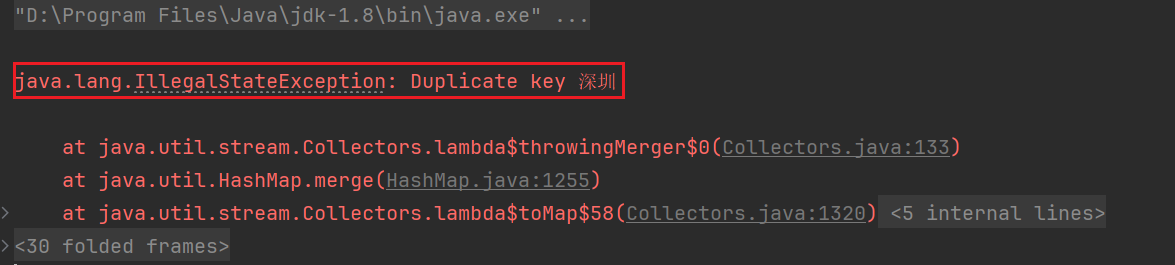 如果出现重复键,且没有提供mergeFunction参数,会抛出java.lang.IllegalStateException异常,如下示例: