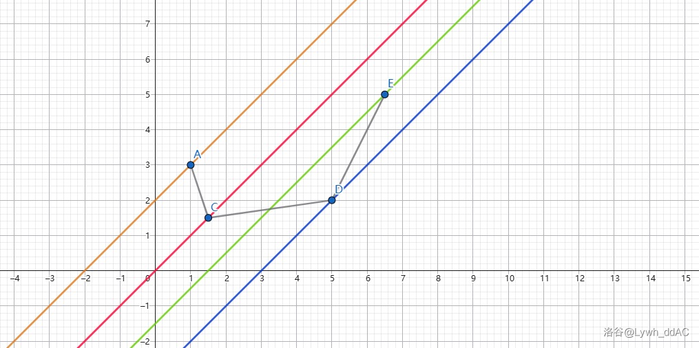 而且针对不同斜率,最优点也是不一样的,比如斜率稍大时可能 E 点是最优点,而当斜率稍小时 C 有可能成为最优点。所以这就是为什么说要先维护一个最优点集而不是一个最优点。