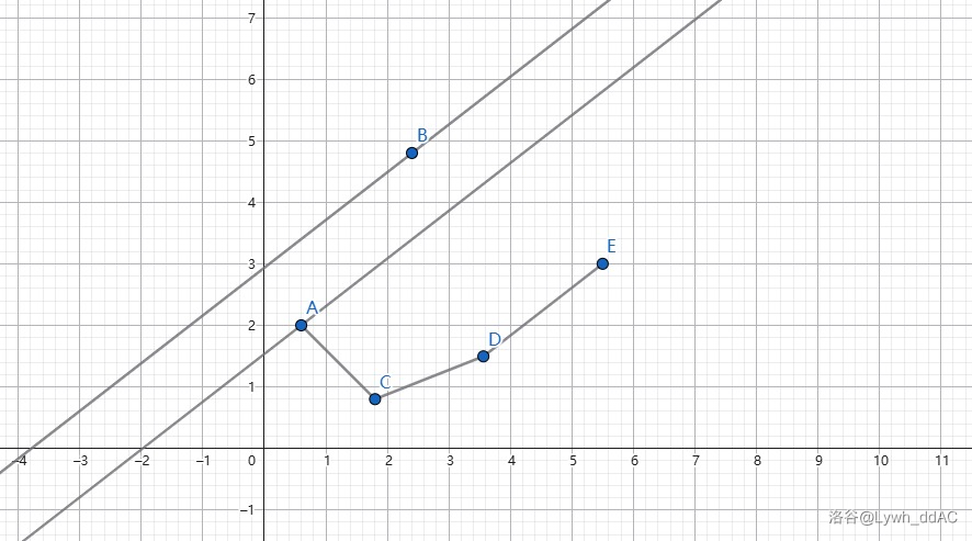 虽然不知道斜率是多少,但我们知道斜率的正负(\(2t[i]\) 肯定为正),也就是直线成上升趋势,我们发现,如果此时有多个点,未知斜率直线的最小截距,只有可能在经过 A,C,D,E 的直线上产生,也就是最优点不可能是 B 点,因为不管一条斜率为多少(不为负)的直线经过 B 它的截距一定比同斜率经过 A 点的直线大。
