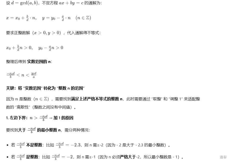 \[\lceil {\frac {-x_0 * d + 1}{b}} \rceil \le k \le \lfloor {\frac {-y_0 * d - 1}{a}} \rfloor \]