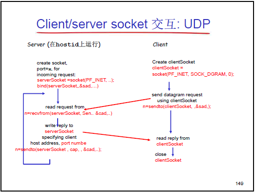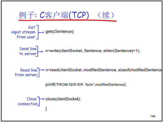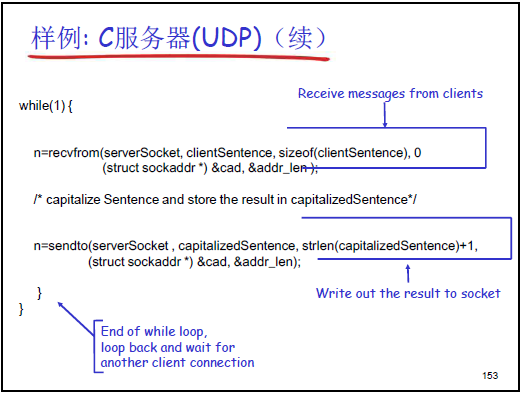 | 5 | 回复客户端:sendto(serverSocket, capitalizedSentence, strlen(capitalizedSentence)+1, (struct sockaddr *)&cad, &addr_len) |