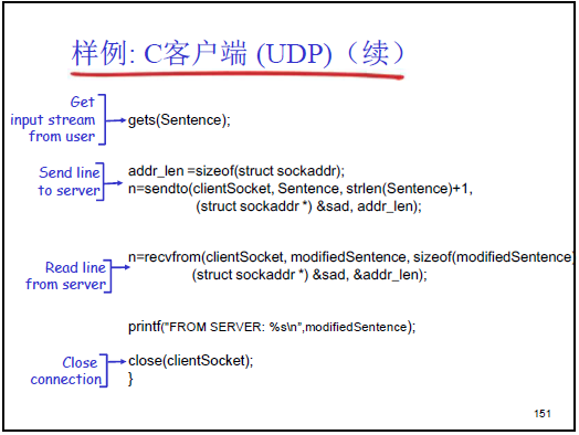 | 5 | 接收服务器回复:recvfrom(clientSocket, modifiedSentence, sizeof(modifiedSentence), 0, (struct sockaddr *)&sad, &addr_len) |